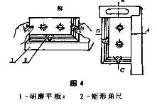 研磨矩形角尺圓弧測量面,也可以用手拿著矩形角尺,在研磨平板上向左和向右,或向前和向后研磨幾次,向左向前傾斜應隨著抬起到直立時再向右或向后傾斜。其中,應隨時注意檢查垂直度和90°角。如圖4所示。